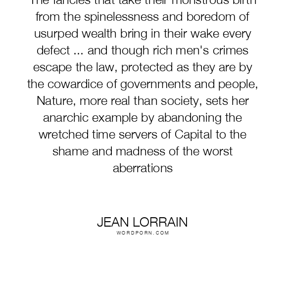 The fancies that take their monstrous birth from the spinelessness and boredom of usurped wealth bring in their wake every defect ... and though rich men's crimes escape the law, protected as they are by the cowardice of governments and people, Nature, more real than society, sets her anarchic example by abandoning the wretched time servers of Capital to the shame and madness of the worst aberrations