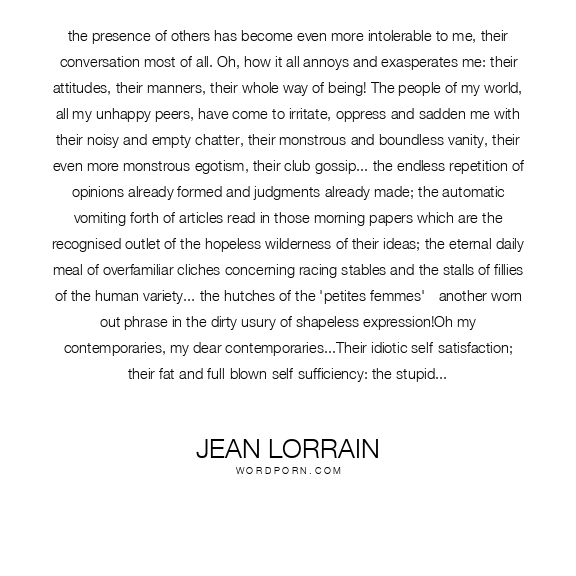 the presence of others has become even more intolerable to me, their conversation most of all. Oh, how it all annoys and exasperates me: their attitudes, their manners, their whole way of being! The people of my world, all my unhappy peers, have come to irritate, oppress and sadden me with their noisy and empty chatter, their monstrous and boundless vanity, their even more monstrous egotism, their club gossip... the endless repetition of opinions already formed and judgments already made; the automatic vomiting forth of articles read in those morning papers which are the recognised outlet of the hopeless wilderness of their ideas; the eternal daily meal of overfamiliar cliches concerning racing stables and the stalls of fillies of the human variety... the hutches of the 'petites femmes' - another worn out phrase in the dirty usury of shapeless expression!Oh my contemporaries, my dear contemporaries...Their idiotic self-satisfaction; their fat and full-blown self-sufficiency: the stupid display of their good fortune; the clink of fifty- and a hundred-franc coins forever sounding out their financial prowess, according their own reckoning; their hen-like clucking and their pig-like grunting, as they pronounce the names of certain women; the obesity of their minds, the obscenity of their eyes, and the toneless-ness of their laughter! They are, in truth, handsome puppets of amour, with all the exhausted despondency of their gestures and the slackness of their chic...Chic! A hideous word, which fits their manner like a new glove: as dejected as undertakers' mutes, as full-blown as Falstaff...Oh my contemporaries: the ceusses of my circle, to put it in their own ignoble argot. They have all welcomed the moneylenders into their homes, and have been recruited as their clients, and they have likewise played host to the fat journalists who milk their conversations for the society columns. How I hate them; how I execrate them; how I would love to devour them liver and lights - and how well I understand the Anarchists and their bombs!