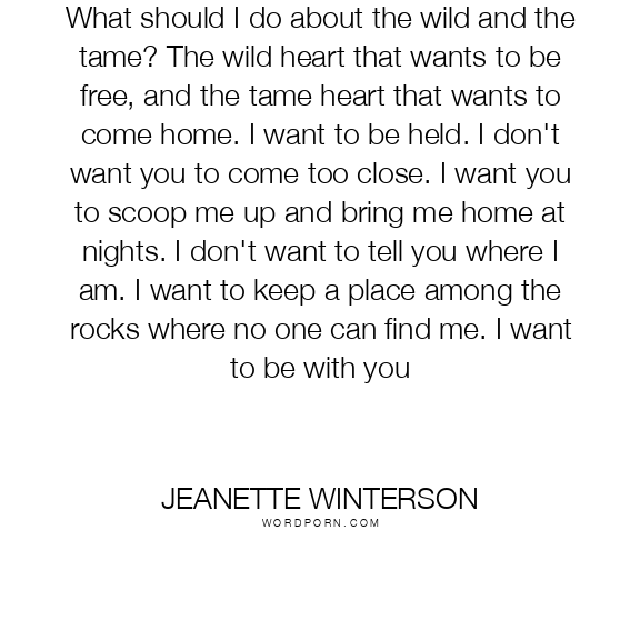 What should I do about the wild and the tame? The wild heart that wants to be free, and the tame heart that wants to come home. I want to be held. I don't want you to come too close. I want you to scoop me up and bring me home at nights. I don't want to tell you where I am. I want to keep a place among the rocks where no one can find me. I want to be with you