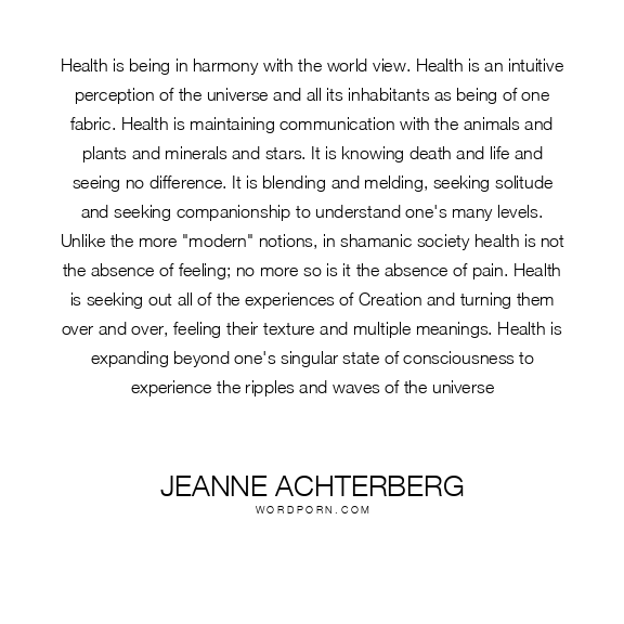 Health is being in harmony with the world view. Health is an intuitive perception of the universe and all its inhabitants as being of one fabric. Health is maintaining communication with the animals and plants and minerals and stars. It is knowing death and life and seeing no difference. It is blending and melding, seeking solitude and seeking companionship to understand one's many levels. Unlike the more "modern" notions, in shamanic society health is not the absence of feeling; no more so is it the absence of pain. Health is seeking out all of the experiences of Creation and turning them over and over, feeling their texture and multiple meanings. Health is expanding beyond one's singular state of consciousness to experience the ripples and waves of the universe