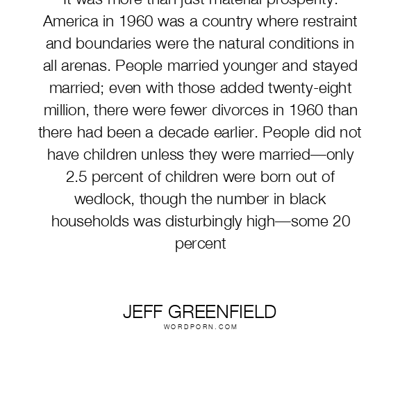 It was more than just material prosperity. America in 1960 was a country where restraint and boundaries were the natural conditions in all arenas. People married younger and stayed married; even with those added twenty-eight million, there were fewer divorces in 1960 than there had been a decade earlier. People did not have children unless they were married—only 2.5 percent of children were born out of wedlock, though the number in black households was disturbingly high—some 20 percent