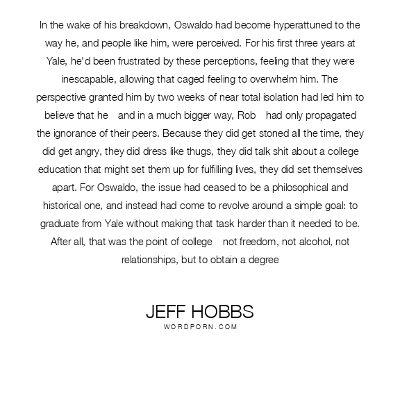 In the wake of his breakdown, Oswaldo had become hyperattuned to the way he, and people like him, were perceived. For his first three years at Yale, he'd been frustrated by these perceptions, feeling that they were inescapable, allowing that caged feeling to overwhelm him. The perspective granted him by two weeks of near total isolation had led him to believe that he––and in a much bigger way, Rob––had only propagated the ignorance of their peers. Because they did get stoned all the time, they did get angry, they did dress like thugs, they did talk shit about a college education that might set them up for fulfilling lives, they did set themselves apart. For Oswaldo, the issue had ceased to be a philosophical and historical one, and instead had come to revolve around a simple goal: to graduate from Yale without making that task harder than it needed to be. After all, that was the point of college––not freedom, not alcohol, not relationships, but to obtain a degree