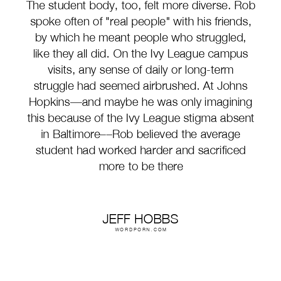 The student body, too, felt more diverse. Rob spoke often of "real people" with his friends, by which he meant people who struggled, like they all did. On the Ivy League campus visits, any sense of daily or long-term struggle had seemed airbrushed. At Johns Hopkins––and maybe he was only imagining this because of the Ivy League stigma absent in Baltimore––Rob believed the average student had worked harder and sacrificed more to be there