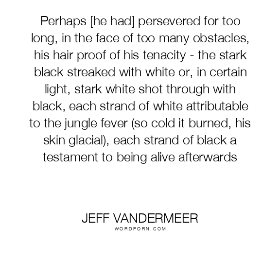 Perhaps [he had] persevered for too long, in the face of too many obstacles, his hair proof of his tenacity - the stark black streaked with white or, in certain light, stark white shot through with black, each strand of white attributable to the jungle fever (so cold it burned, his skin glacial), each strand of black a testament to being alive afterwards