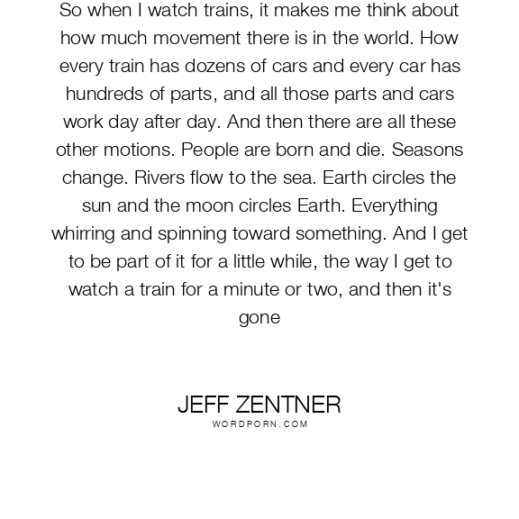 So when I watch trains, it makes me think about how much movement there is in the world. How every train has dozens of cars and every car has hundreds of parts, and all those parts and cars work day after day. And then there are all these other motions. People are born and die. Seasons change. Rivers flow to the sea. Earth circles the sun and the moon circles Earth. Everything whirring and spinning toward something. And I get to be part of it for a little while, the way I get to watch a train for a minute or two, and then it's gone
