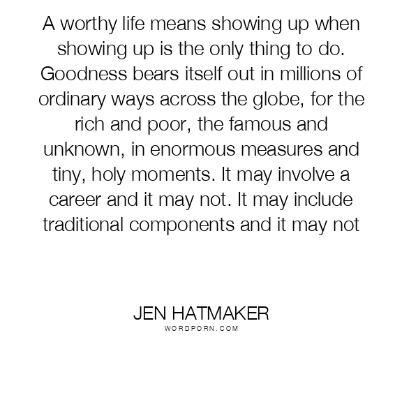 A worthy life means showing up when showing up is the only thing to do. Goodness bears itself out in millions of ordinary ways across the globe, for the rich and poor, the famous and unknown, in enormous measures and tiny, holy moments. It may involve a career and it may not. It may include traditional components and it may not