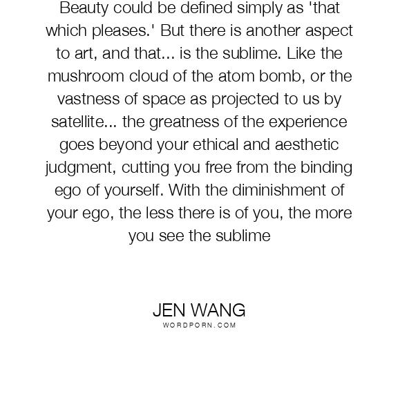 Beauty could be defined simply as 'that which pleases.' But there is another aspect to art, and that... is the sublime. Like the mushroom cloud of the atom bomb, or the vastness of space as projected to us by satellite... the greatness of the experience goes beyond your ethical and aesthetic judgment, cutting you free from the binding ego of yourself. With the diminishment of your ego, the less there is of you, the more you see the sublime