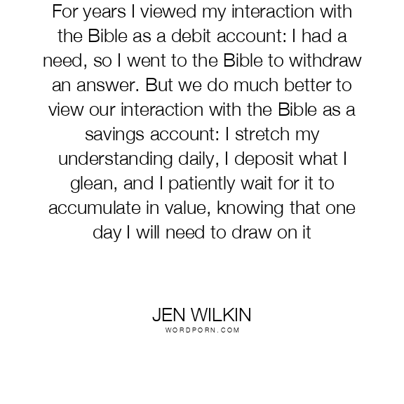For years I viewed my interaction with the Bible as a debit account: I had a need, so I went to the Bible to withdraw an answer. But we do much better to view our interaction with the Bible as a savings account: I stretch my understanding daily, I deposit what I glean, and I patiently wait for it to accumulate in value, knowing that one day I will need to draw on it