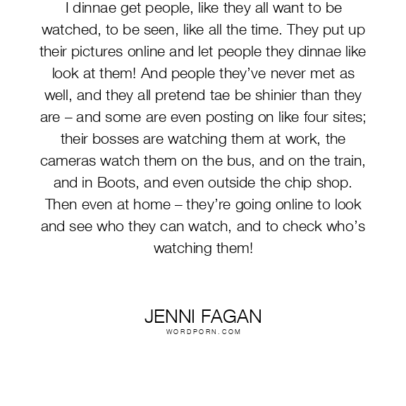 I dinnae get people, like they all want to be watched, to be seen, like all the time. They put up their pictures online and let people they dinnae like look at them! And people they’ve never met as well, and they all pretend tae be shinier than they are – and some are even posting on like four sites; their bosses are watching them at work, the cameras watch them on the bus, and on the train, and in Boots, and even outside the chip shop. Then even at home – they’re going online to look and see who they can watch, and to check who’s watching them!