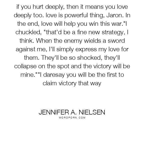 if you hurt deeply, then it means you love deeply too. love is powerful thing, Jaron. In the end, love will help you win this war."I chuckled, "that'd be a fine new strategy, I think. When the enemy wields a sword against me, I'll simply express my love for them. They'll be so shocked, they'll collapse on the spot and the victory will be mine.""I daresay you will be the first to claim victory that way