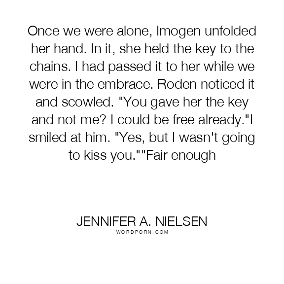 Once we were alone, Imogen unfolded her hand. In it, she held the key to the chains. I had passed it to her while we were in the embrace. Roden noticed it and scowled. "You gave her the key and not me? I could be free already."I smiled at him. "Yes, but I wasn't going to kiss you.""Fair enough