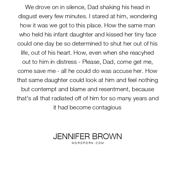 We drove on in silence, Dad shaking his head in disgust every few minutes. I stared at him, wondering how it was we got to this place. How the same man who held his infant daughter and kissed her tiny face could one day be so determined to shut her out of his life, out of his heart. How, even when she reacyhed out to him in distress - Please, Dad, come get me, come save me - all he could do was accuse her. How that same daughter could look at him and feel nothing but contempt and blame and resentment, because that's all that radiated off of him for so many years and it had become contagious