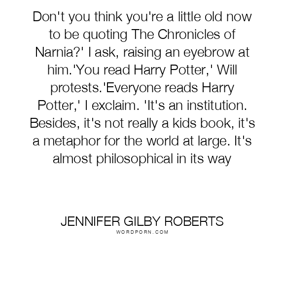 Don't you think you're a little old now to be quoting The Chronicles of Narnia?' I ask, raising an eyebrow at him.'You read Harry Potter,' Will protests.'Everyone reads Harry Potter,' I exclaim. 'It's an institution. Besides, it's not really a kids book, it's a metaphor for the world at large. It's almost philosophical in its way