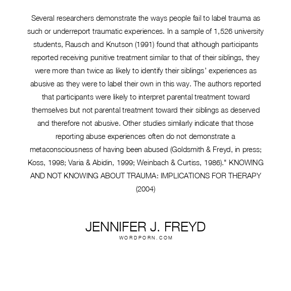 Jennifer J. Freyd quote. Several researchers demonstrate the ways people fail to label trauma as such or underreport traumatic experiences. In a sample of 1,526 university students, Rausch and Knutson (1991) found that although participants reported receiving punitive treatment similar to that of their siblings, they were more than twice as likely to identify their siblings’ experiences as abusive as they were to label their own in this way. The authors reported that participants were likely to interpret parental treatment toward themselves but not parental treatment toward their siblings as deserved and therefore not abusive. Other studies similarly indicate that those reporting abuse experiences often do not demonstrate a metaconsciousness of having been abused (Goldsmith & Freyd, in press; Koss, 1998; Varia & Abidin, 1999; Weinbach & Curtiss, 1986).