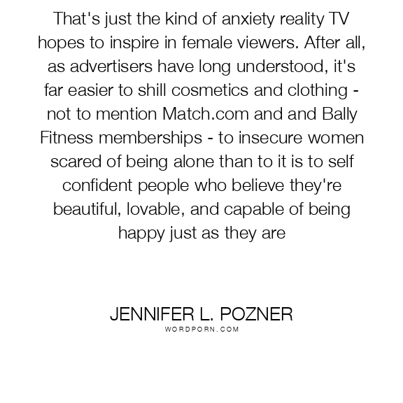 That's just the kind of anxiety reality TV hopes to inspire in female viewers. After all, as advertisers have long understood, it's far easier to shill cosmetics and clothing - not to mention Match.com and and Bally Fitness memberships - to insecure women scared of being alone than to it is to self confident people who believe they're beautiful, lovable, and capable of being happy just as they are