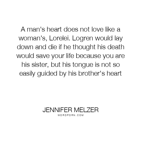 A man's heart does not love like a woman's, Lorelei. Logren would lay down and die if he thought his death would save your life because you are his sister, but his tongue is not so easily guided by his brother's heart