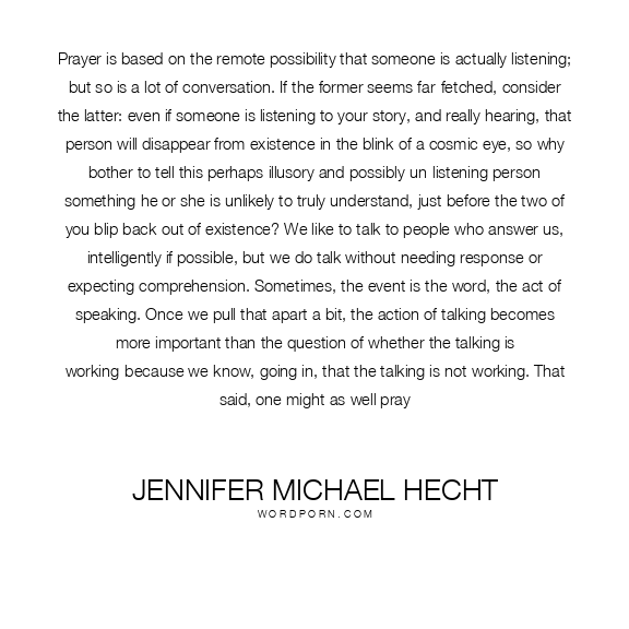 Prayer is based on the remote possibility that someone is actually listening; but so is a lot of conversation. If the former seems far-fetched, consider the latter: even if someone is listening to your story, and really hearing, that person will disappear from existence in the blink of a cosmic eye, so why bother to tell this perhaps illusory and possibly un-listening person something he or she is unlikely to truly understand, just before the two of you blip back out of existence? We like to talk to people who answer us, intelligently if possible, but we do talk without needing response or expecting comprehension. Sometimes, the event is the word, the act of speaking. Once we pull that apart a bit, the action of talking becomes more important than the question of whether the talking is working-because we know, going in, that the talking is not working. That said, one might as well pray