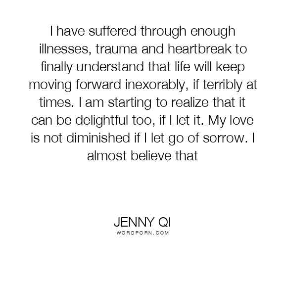 I have suffered through enough illnesses, trauma and heartbreak to finally understand that life will keep moving forward inexorably, if terribly at times. I am starting to realize that it can be delightful too, if I let it. My love is not diminished if I let go of sorrow. I almost believe that
