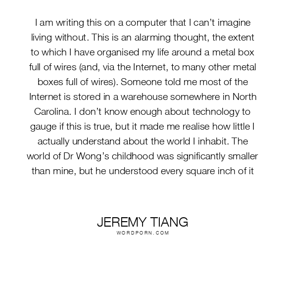 I am writing this on a computer that I can’t imagine living without. This is an alarming thought, the extent to which I have organised my life around a metal box full of wires (and, via the Internet, to many other metal boxes full of wires). Someone told me most of the Internet is stored in a warehouse somewhere in North Carolina. I don’t know enough about technology to gauge if this is true, but it made me realise how little I actually understand about the world I inhabit. The world of Dr Wong’s childhood was significantly smaller than mine, but he understood every square inch of it