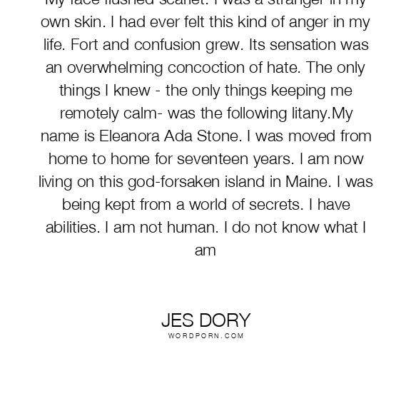 My face flushed scarlet. I was a stranger in my own skin. I had ever felt this kind of anger in my life. Fort and confusion grew. Its sensation was an overwhelming concoction of hate. The only things I knew - the only things keeping me remotely calm- was the following litany.My name is Eleanora Ada Stone. I was moved from home to home for seventeen years. I am now living on this god-forsaken island in Maine. I was being kept from a world of secrets. I have abilities. I am not human. I do not know what I am