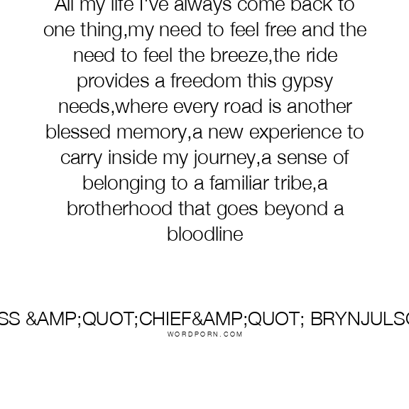 All my life I've always come back to one thing,my need to feel free and the need to feel the breeze,the ride provides a freedom this gypsy needs,where every road is another blessed memory,a new experience to carry inside my journey,a sense of belonging to a familiar tribe,a brotherhood that goes beyond a bloodline