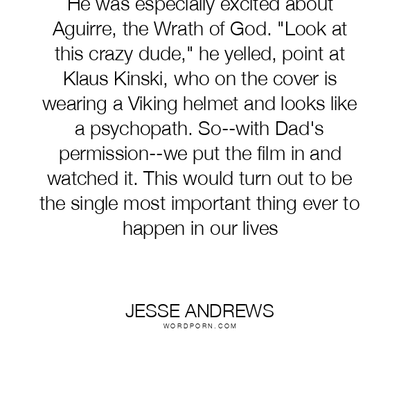 He was especially excited about Aguirre, the Wrath of God. "Look at this crazy dude," he yelled, point at Klaus Kinski, who on the cover is wearing a Viking helmet and looks like a psychopath. So--with Dad's permission--we put the film in and watched it. This would turn out to be the single most important thing ever to happen in our lives