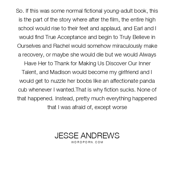 So. If this was some normal fictional young-adult book, this is the part of the story where after the film, the entire high school would rise to their feet and applaud, and Earl and I would find True Acceptance and begin to Truly Believe in Ourselves and Rachel would somehow miraculously make a recovery, or maybe she would die but we would Always Have Her to Thank for Making Us Discover Our Inner Talent, and Madison would become my girlfriend and I would get to nuzzle her boobs like an affectionate panda cub whenever I wanted.That is why fiction sucks. None of that happened. Instead, pretty much everything happened that I was afraid of, except worse
