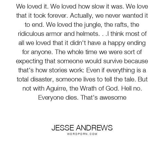 We loved it. We loved how slow it was. We love that it took forever. Actually, we never wanted it to end. We loved the jungle, the rafts, the ridiculous armor and helmets. . .I think most of all we loved that it didn't have a happy ending for anyone. The whole time we were sort of expecting that someone would survive because that's how stories work: Even if everything is a total disaster, someone lives to tell the tale. But not with Aguirre, the Wrath of God. Hell no. Everyone dies. That's awesome