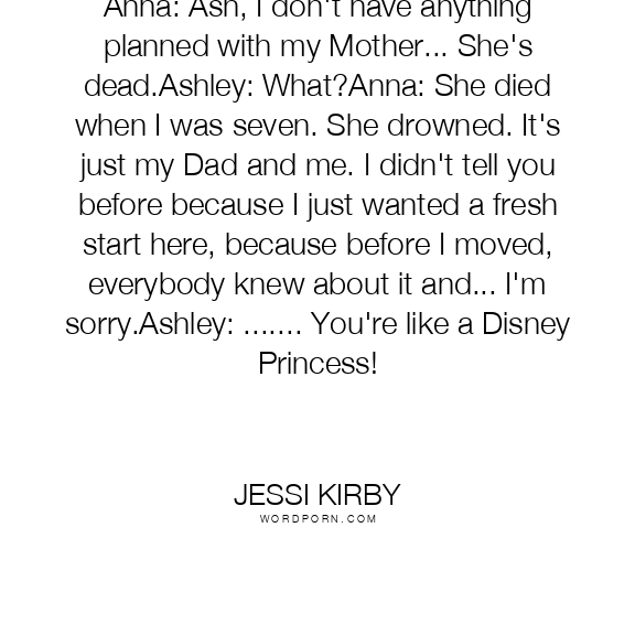 Anna: Ash, I don't have anything planned with my Mother... She's dead.Ashley: What?Anna: She died when I was seven. She drowned. It's just my Dad and me. I didn't tell you before because I just wanted a fresh start here, because before I moved, everybody knew about it and... I'm sorry.Ashley: ....... You're like a Disney Princess!