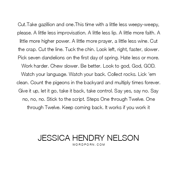 Cut.Take gazillion and one.This time with a little less weepy-weepy, please. A little less improvisation. A little less lip. A little more faith. A little more higher power. A little more prayer, a little less wine. Cut the crap. Cut the line. Tuck the chin. Look left, right, faster, slower. Pick seven dandelions on the first day of spring. Hate less or more. Work harder. Chew slower. Be better. Look to god, God, GOD. Watch your language. Watch your back. Collect rocks. Lick 'em clean. Count the pigeons in the backyard and multiply times forever. Give it up, let it go, take it back, take control. Say yes, say no. Say no, no, no. Stick to the script. Steps One through Twelve. One through Twelve. Keep coming back. It works if you work it
