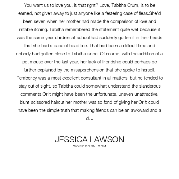 You want us to love you, is that right? Love, Tabitha Crum, is to be earned, not given away to just anyone like a festering case of fleas.She'd been seven when her mother had made the comparison of love and irritable itching. Tabitha remembered the statement quite well because it was the same year children at school had suddenly gotten it in their heads that she had a case of head lice. That had been a difficult time and nobody had gotten close to Tabitha since. Of course, with the addition of a pet mouse over the last year, her lack of friendship could perhaps be further explained by the misapprehension that she spoke to herself. Pemberley was a most excellent consultant in all matters, but he tended to stay out of sight, so Tabitha could somewhat understand the slanderous comments.Or it might have been the unfortunate, uneven unattractive, blunt-scissored haircut her mother was so fond of giving her.Or it could have been the simple truth that making friends can be an awkward and a difficult thing when it's a one-sided endeavor and you've a pet mouse and you've been painted as odd and quiet and shy, when really you're just a bit misunderstood.In any case, nobody at St. John's seemed lacking for companionship except her. But Tabitha reminded herself that there were far worse things than not having friends. In fact, she often made a game of listing far worse things:•eating the contents of a sneeze•creatures crawling into her ear holes.•losing a body part (Though that one was debatable depending on the part. An ear or small toe might be worth a friend or two