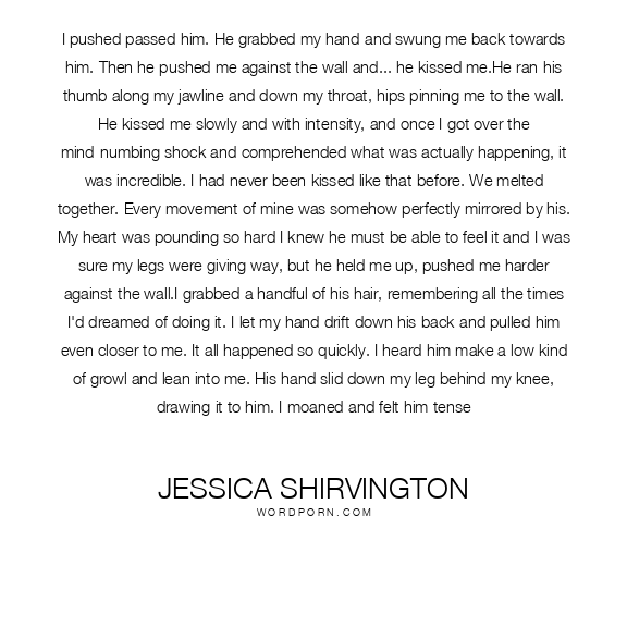 I pushed passed him. He grabbed my hand and swung me back towards him. Then he pushed me against the wall and... he kissed me.He ran his thumb along my jawline and down my throat, hips pinning me to the wall. He kissed me slowly and with intensity, and once I got over the mind-numbing shock and comprehended what was actually happening, it was incredible. I had never been kissed like that before. We melted together. Every movement of mine was somehow perfectly mirrored by his. My heart was pounding so hard I knew he must be able to feel it and I was sure my legs were giving way, but he held me up, pushed me harder against the wall.I grabbed a handful of his hair, remembering all the times I'd dreamed of doing it. I let my hand drift down his back and pulled him even closer to me. It all happened so quickly. I heard him make a low kind of growl and lean into me. His hand slid down my leg behind my knee, drawing it to him. I moaned and felt him tense