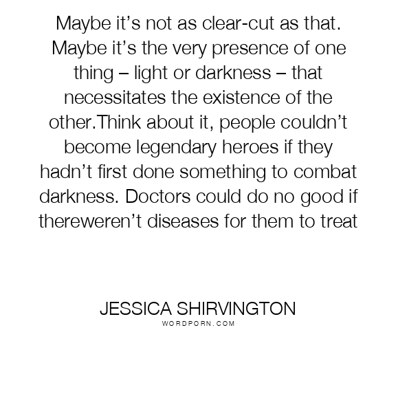 Maybe it’s not as clear-cut as that. Maybe it’s the very presence of one thing – light or darkness – that necessitates the existence of the other.Think about it, people couldn’t become legendary heroes if they hadn’t first done something to combat darkness. Doctors could do no good if thereweren’t diseases for them to treat