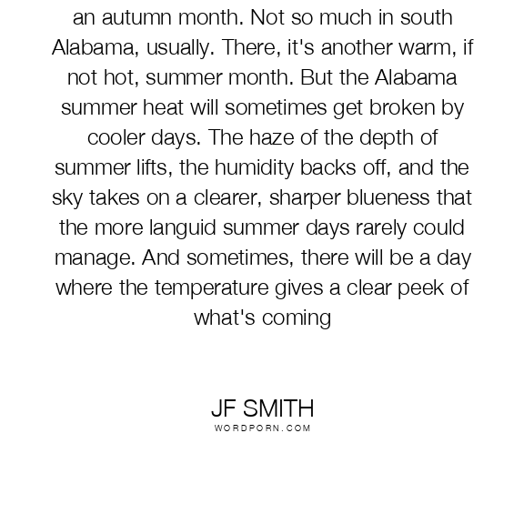 Everyone tends to think of October as being an autumn month. Not so much in south Alabama, usually. There, it's another warm, if not hot, summer month. But the Alabama summer heat will sometimes get broken by cooler days. The haze of the depth of summer lifts, the humidity backs off, and the sky takes on a clearer, sharper blueness that the more languid summer days rarely could manage. And sometimes, there will be a day where the temperature gives a clear peek of what's coming