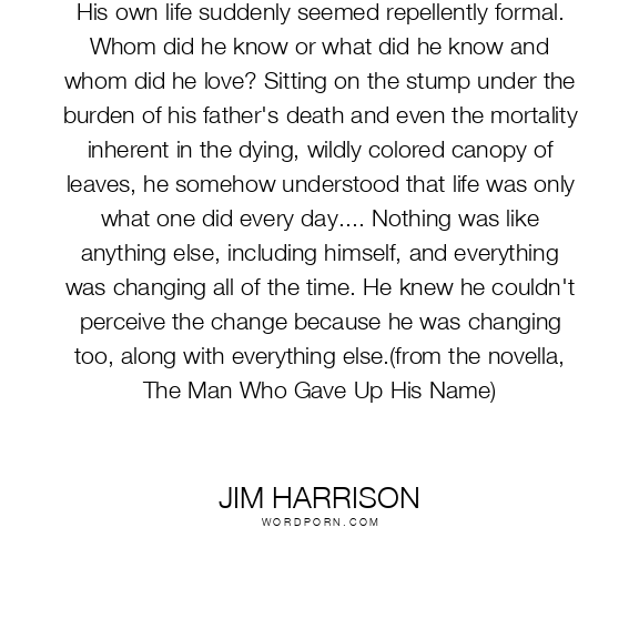 His own life suddenly seemed repellently formal. Whom did he know or what did he know and whom did he love? Sitting on the stump under the burden of his father's death and even the mortality inherent in the dying, wildly colored canopy of leaves, he somehow understood that life was only what one did every day.... Nothing was like anything else, including himself, and everything was changing all of the time. He knew he couldn't perceive the change because he was changing too, along with everything else.(from the novella, The Man Who Gave Up His Name)