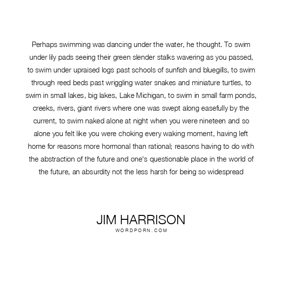 Perhaps swimming was dancing under the water, he thought. To swim under lily pads seeing their green slender stalks wavering as you passed, to swim under upraised logs past schools of sunfish and bluegills, to swim through reed beds past wriggling water snakes and miniature turtles, to swim in small lakes, big lakes, Lake Michigan, to swim in small farm ponds, creeks, rivers, giant rivers where one was swept along easefully by the current, to swim naked alone at night when you were nineteen and so alone you felt like you were choking every waking moment, having left home for reasons more hormonal than rational; reasons having to do with the abstraction of the future and one's questionable place in the world of the future, an absurdity not the less harsh for being so widespread