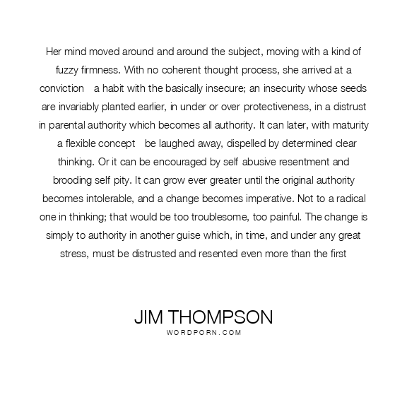 Her mind moved around and around the subject, moving with a kind of fuzzy firmness. With no coherent thought process, she arrived at a conviction - a habit with the basically insecure; an insecurity whose seeds are invariably planted earlier, in under or over-protectiveness, in a distrust in parental authority which becomes all authority. It can later, with maturity - a flexible concept - be laughed away, dispelled by determined clear thinking. Or it can be encouraged by self-abusive resentment and brooding self-pity. It can grow ever greater until the original authority becomes intolerable, and a change becomes imperative. Not to a radical one in thinking; that would be too troublesome, too painful. The change is simply to authority in another guise which, in time, and under any great stress, must be distrusted and resented even more than the first