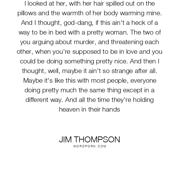I looked at her, with her hair spilled out on the pillows and the warmth of her body warming mine. And I thought, god-dang, if this ain't a heck of a way to be in bed with a pretty woman. The two of you arguing about murder, and threatening each other, when you're supposed to be in love and you could be doing something pretty nice. And then I thought, well, maybe it ain't so strange after all. Maybe it's like this with most people, everyone doing pretty much the same thing except in a different way. And all the time they're holding heaven in their hands