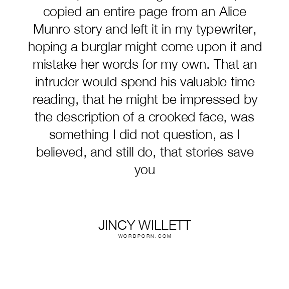 Once, before leaving on vacation, I copied an entire page from an Alice Munro story and left it in my typewriter, hoping a burglar might come upon it and mistake her words for my own. That an intruder would spend his valuable time reading, that he might be impressed by the description of a crooked face, was something I did not question, as I believed, and still do, that stories save you