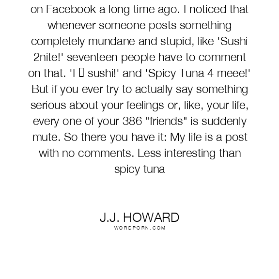 Okay, so I stopped posting status updates on Facebook a long time ago. I noticed that whenever someone posts something completely mundane and stupid, like 'Sushi 2nite!' seventeen people have to comment on that. 'I ♥ sushi!' and 'Spicy Tuna 4 meee!' But if you ever try to actually say something serious about your feelings or, like, your life, every one of your 386 "friends" is suddenly mute. So there you have it: My life is a post with no comments. Less interesting than spicy tuna