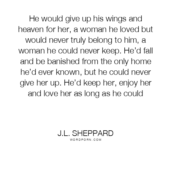 He would give up his wings and heaven for her, a woman he loved but would never truly belong to him, a woman he could never keep. He’d fall and be banished from the only home he’d ever known, but he could never give her up. He’d keep her, enjoy her and love her as long as he could