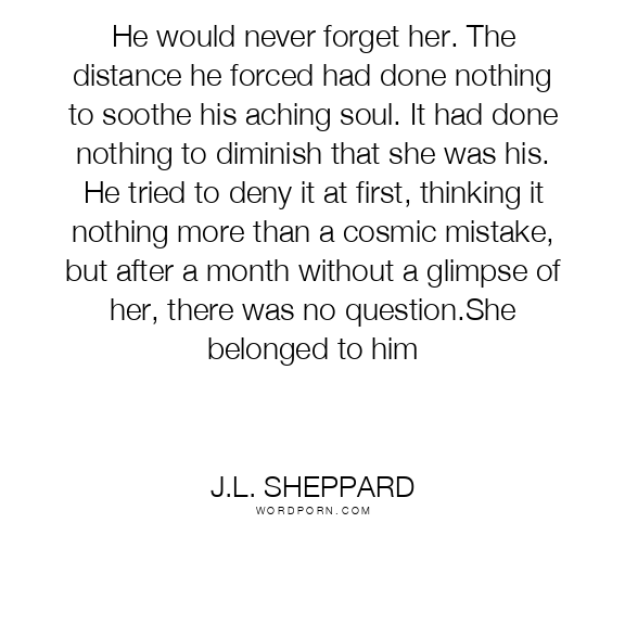 He would never forget her. The distance he forced had done nothing to soothe his aching soul. It had done nothing to diminish that she was his. He tried to deny it at first, thinking it nothing more than a cosmic mistake, but after a month without a glimpse of her, there was no question.She belonged to him