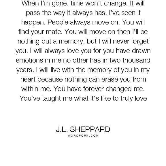 When I’m gone, time won’t change. It will pass the way it always has. I’ve seen it happen. People always move on. You will find your mate. You will move on then I’ll be nothing but a memory, but I will never forget you. I will always love you for you have drawn emotions in me no other has in two thousand years. I will live with the memory of you in my heart because nothing can erase you from within me. You have forever changed me. You’ve taught me what it’s like to truly love