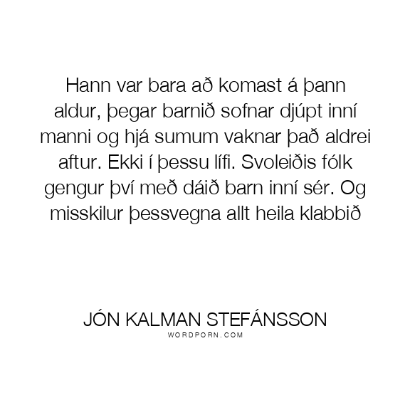 Hann var bara að komast á þann aldur, þegar barnið sofnar djúpt inní manni og hjá sumum vaknar það aldrei aftur. Ekki í þessu lífi. Svoleiðis fólk gengur því með dáið barn inní sér. Og misskilur þessvegna allt heila klabbið