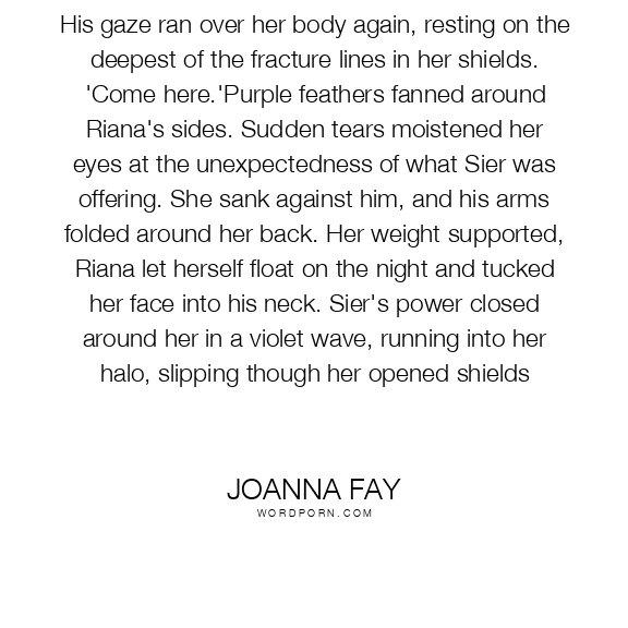 His gaze ran over her body again, resting on the deepest of the fracture lines in her shields. 'Come here.'Purple feathers fanned around Riana's sides. Sudden tears moistened her eyes at the unexpectedness of what Sier was offering. She sank against him, and his arms folded around her back. Her weight supported, Riana let herself float on the night and tucked her face into his neck. Sier's power closed around her in a violet wave, running into her halo, slipping though her opened shields