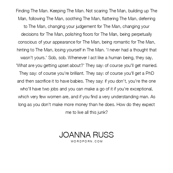 Finding The Man. Keeping The Man. Not scaring The Man, building up The Man, following The Man, soothing The Man, flattering The Man, deferring to The Man, changing your judgement for The Man, changing your decisions for The Man, polishing floors for The Man, being perpetually conscious of your appearance for The Man, being romantic for The Man, hinting to The Man, losing yourself in The Man. 'I never had a thought that wasn't yours.' Sob, sob. Whenever I act like a human being, they say, 'What are you getting upset about?' They say: of course you'll get married. They say: of course you're brilliant. They say: of course you'll get a PhD and then sacrifice it to have babies. They say: if you don't, you're the one who'll have two jobs and you can make a go of it if you're exceptional, which very few women are, and if you find a very understanding man. As long as you don't make more money than he does. How do they expect me to live all this junk?