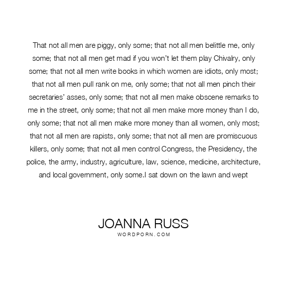 That not all men are piggy, only some; that not all men belittle me, only some; that not all men get mad if you won’t let them play Chivalry, only some; that not all men write books in which women are idiots, only most; that not all men pull rank on me, only some; that not all men pinch their secretaries’ asses, only some; that not all men make obscene remarks to me in the street, only some; that not all men make more money than I do, only some; that not all men make more money than all women, only most; that not all men are rapists, only some; that not all men are promiscuous killers, only some; that not all men control Congress, the Presidency, the police, the army, industry, agriculture, law, science, medicine, architecture, and local government, only some.I sat down on the lawn and wept