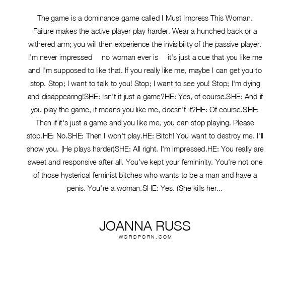 The game is a dominance game called I Must Impress This Woman. Failure makes the active player play harder. Wear a hunched back or a withered arm; you will then experience the invisibility of the passive player. I'm never impressed -- no woman ever is -- it's just a cue that you like me and I'm supposed to like that. If you really like me, maybe I can get you to stop. Stop; I want to talk to you! Stop; I want to see you! Stop; I'm dying and disappearing!SHE: Isn't it just a game?HE: Yes, of course.SHE: And if you play the game, it means you like me, doesn't it?HE: Of course.SHE: Then if it's just a game and you like me, you can stop playing. Please stop.HE: No.SHE: Then I won't play.HE: Bitch! You want to destroy me. I'll show you. (He plays harder)SHE: All right. I'm impressed.HE: You really are sweet and responsive after all. You've kept your femininity. You're not one of those hysterical feminist bitches who wants to be a man and have a penis. You're a woman.SHE: Yes. (She kills herself)