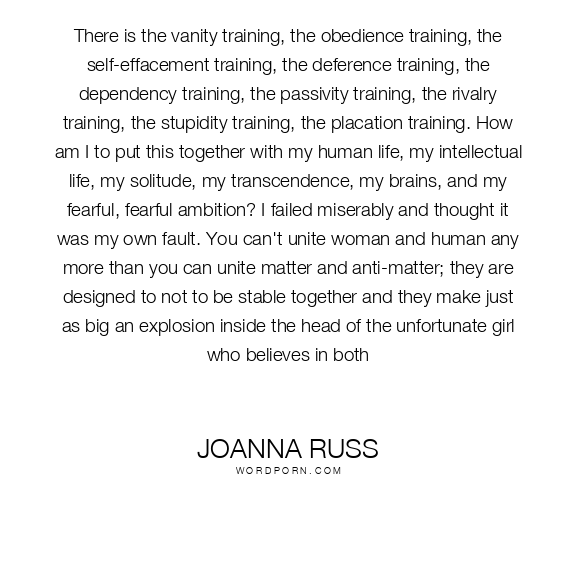 There is the vanity training, the obedience training, the self-effacement training, the deference training, the dependency training, the passivity training, the rivalry training, the stupidity training, the placation training. How am I to put this together with my human life, my intellectual life, my solitude, my transcendence, my brains, and my fearful, fearful ambition? I failed miserably and thought it was my own fault. You can't unite woman and human any more than you can unite matter and anti-matter; they are designed to not to be stable together and they make just as big an explosion inside the head of the unfortunate girl who believes in both