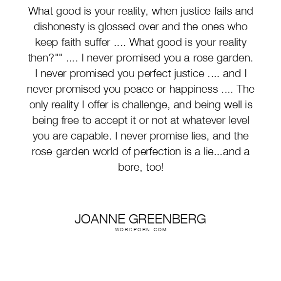 What good is your reality, when justice fails and dishonesty is glossed over and the ones who keep faith suffer .... What good is your reality then?"" .... I never promised you a rose garden. I never promised you perfect justice .... and I never promised you peace or happiness .... The only reality I offer is challenge, and being well is being free to accept it or not at whatever level you are capable. I never promise lies, and the rose-garden world of perfection is a lie...and a bore, too!